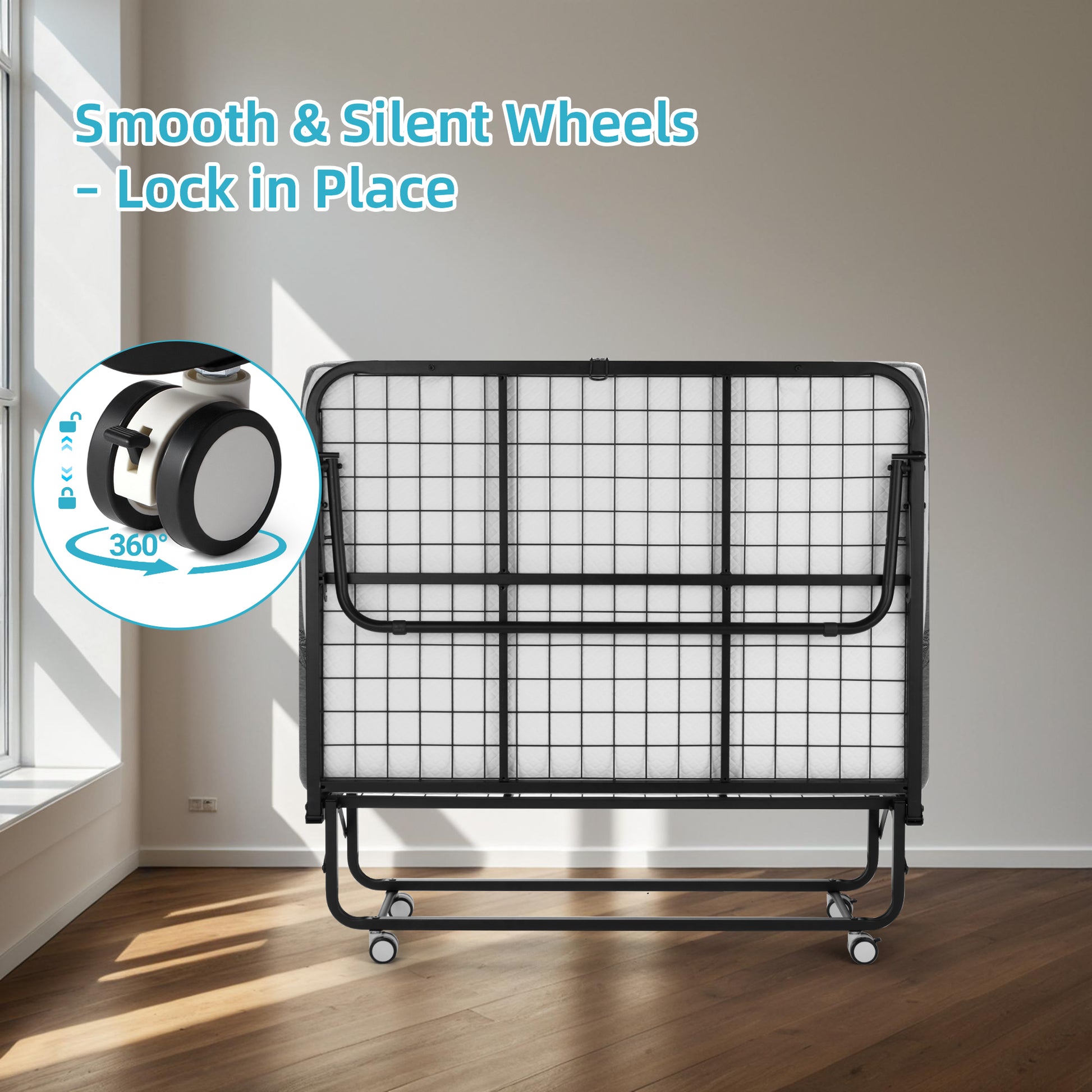 - 【Portable & Space-Saving】This folding bed with mattress features 4 smooth-rolling wheels for effortless mobility, and each wheel can be locked for stability. The quiet wheels won’t scratch your floors. Perfect as a guest bed or daybed in the living room, bedroom, or office, it’s ideal for small apartments, visitors, or quick naps.